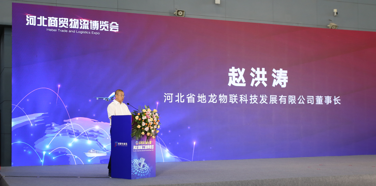 開幕式期間,河北省地龍物聯(lián)科技發(fā)展有限公司董事長趙洪濤受邀為與會嘉賓、參展商和現(xiàn)場觀眾匯報了京津冀商貿(mào)物流行業(yè)的區(qū)位優(yōu)勢、產(chǎn)業(yè)基礎、營商環(huán)境和發(fā)展前景,并介紹了河北地龍智能自動化物流設備、倉儲設備及托盤的研發(fā)、生產(chǎn)、銷售與集成服務情況。